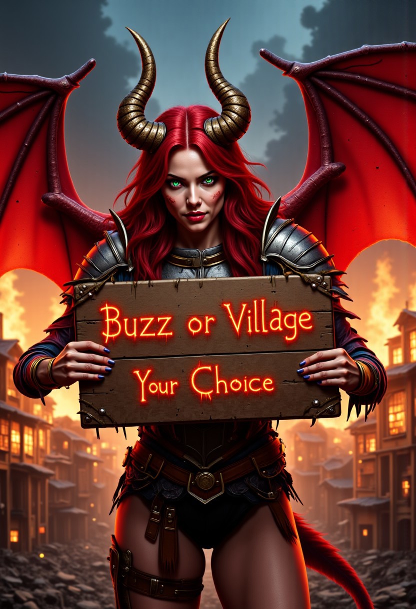 score_9, score_8_up, score_7_up, sfw intricate details, photorealistic, realistic, 1 European woman, hkmagic, red dragon wings, medieval armor, dragon tail, dragon horns, pointy ears, scales, glowing eyes, solo, love live art style, Long hair, red hair, green eyes, slightly uneven skin texture, natural blemishes, philtrum, subtle freckles, scars or imperfections, skindentation, faint crookedness in the nose, subtle wrinkles near the eyes and mouth to convey anger, fierce, scary, ((hands holding a creepy sign that says in a creepy font "Buzz or Village Your Choice")), dramatic lighting on face, golden bracelets, claws, jewelry, low twintails, lips, large sexy voluptuous breasts, perfect sexy sculpted body, large sexy meaty ass, thick sexy meaty thighs, flying, breathing fire, flames, burning village, happy, mischievous, smoke, ground view, dark, night, cloudy, chaos, death, blood, destruction, broken buildings, charred buildings, aidmatextimprover