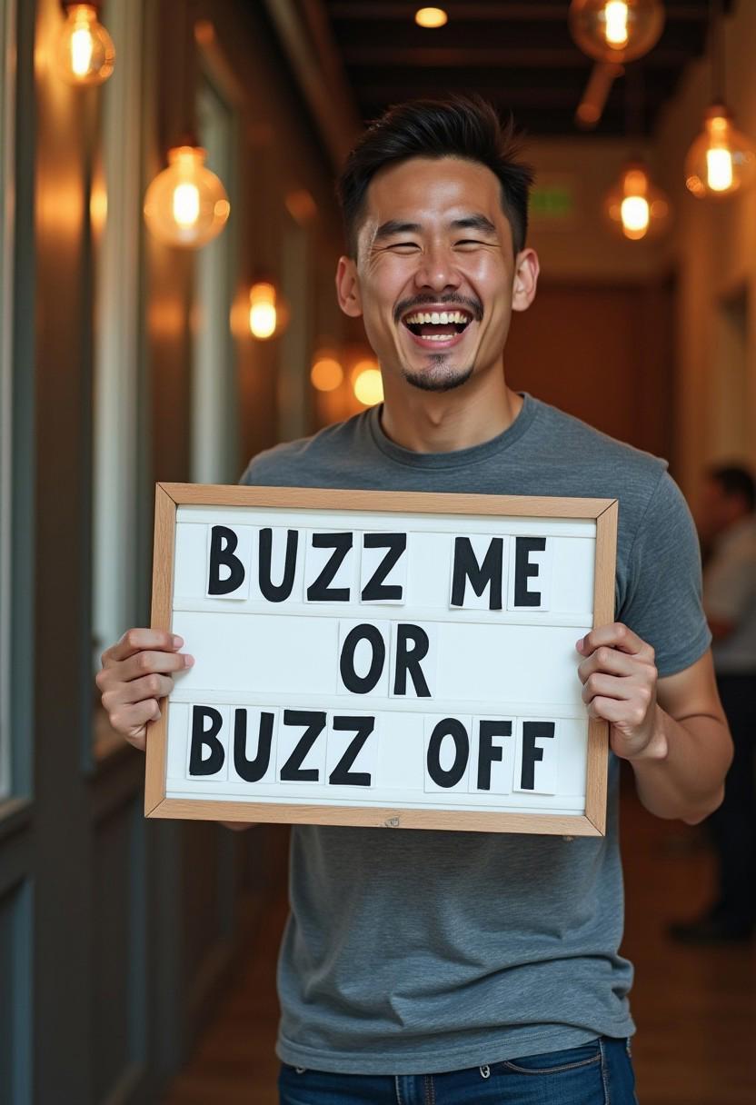 lauging handsome asian man holding a sign it say "buzz me or buzz off"