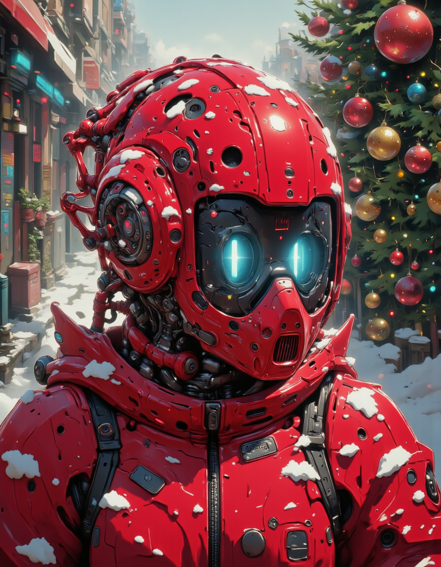 nistyle, concept art Girl in red oily latex, red helmet, covered face, pixel eye, dynamics, digital artwork, illustrative, painterly, matte painting, highly detailed, mechanical , Christmas Theme , christmas mood,magical christmas, a highly detailed, digital illustration in a whimsical, festive style, max details, in a Christmas street, Christmas tree, santa_hat , full body, <lora:flux.1_lora_flyway_Epic-detail_v2:0.5> <lora:CPA:0.7> <lora:test2:0.7> , <lora:Christmas_Dreams:0.9>, <lora:flux.1_lora_ink-dynamic:0.4> , <lora:aidmaImageUpraderv0.3:0.5>