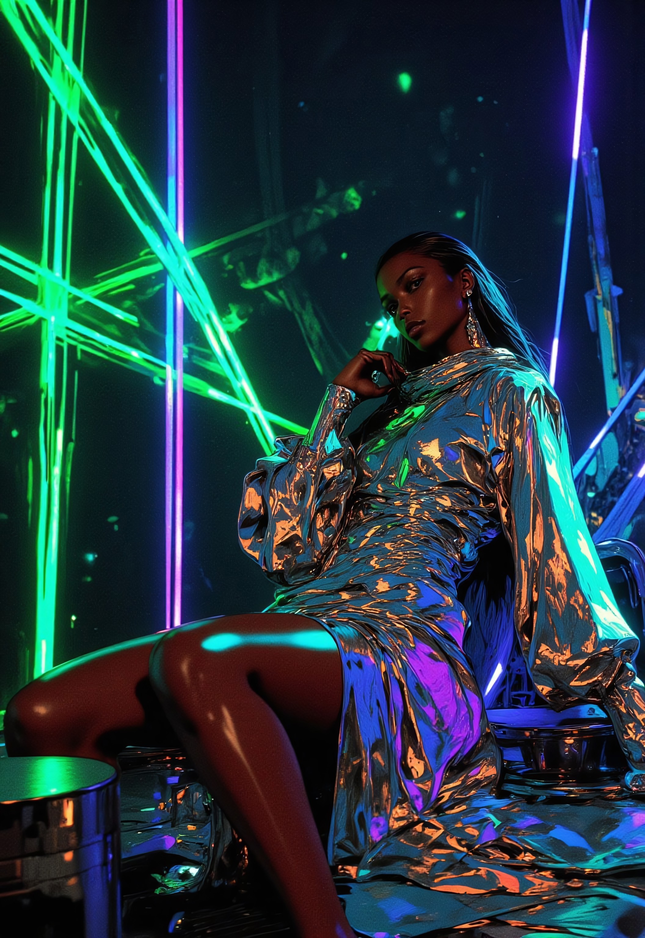 This is a highly stylized, vibrant photograph of a person posing in a dramatic, futuristic setting. The subject is a woman with dark skin, dressed in a shimmering, metallic, one-shoulder dress that catches the light and reflects it in various colors, including green, blue, and purple. The dress is form-fitting and has a high neckline, accentuating the person's slender frame. The person's hair is slicked back, adding to the sleek, modern aesthetic. The background is a dark, moody space with a blue and purple hue, creating a high-contrast effect that highlights the subject. Multiple neon green and blue lights radiate from various angles, creating a dynamic, almost sci-fi atmosphere. The lights intersect and refract off the shiny surface of the dress, creating a dazzling, almost holographic effect. The person is posed in a seated position with one leg bent, creating a sense of movement and dynamism. Their left hand is resting on their knee, while their right hand is raised and bent at the elbow, adding a touch of elegance to the pose. The overall style of the image is highly stylized and artistic, emphasizing both fashion and lighting as key elements.