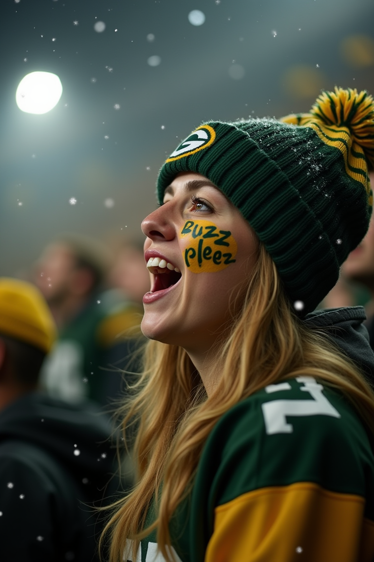 An avid Green Bay packers fan with face painted with text "Buzz please" on one cheek . Wearing a beanie cap. She is in a crowded stadium and cheering. She and the crowd around her are jumping and cheering a touchdown. The image conveys a sense of motion and intense emotion from motion blur and cinematic lighting. Small light snowflakes are floating in the air. Camera angle from side.