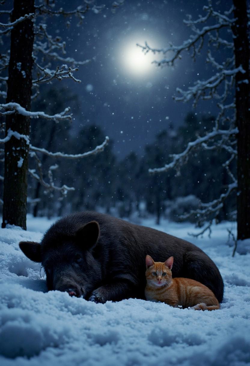 Impressionistic realism by Casey Baugh, in the style of Jed-clrfl, cinematic still image of A wild boar, with its thick, dark bristles and sturdy body, lies curled up on a blanket of fresh snow, its large form almost blending into the whiteness around it. Beside the boar, an orange tabby cat snuggles close, its fur slightly puffed up to keep warm in the chilly air, the contrast of its warm tones against the snow creating a soft, inviting warmth. Both animals are peacefully asleep, their breathing slow and serene, as if the cold winter night is keeping time with their rest. The snow around them is undisturbed, with delicate, frozen icicles hanging from tree branches above. The forest is quiet, with the tall, leafless trees casting long, dark shadows across the snow-covered ground. Above, the night sky is a brilliant canvas of sparkling stars, casting a silvery glow on the scene, while the full moon illuminates the peaceful slumber of the unlikely pair.