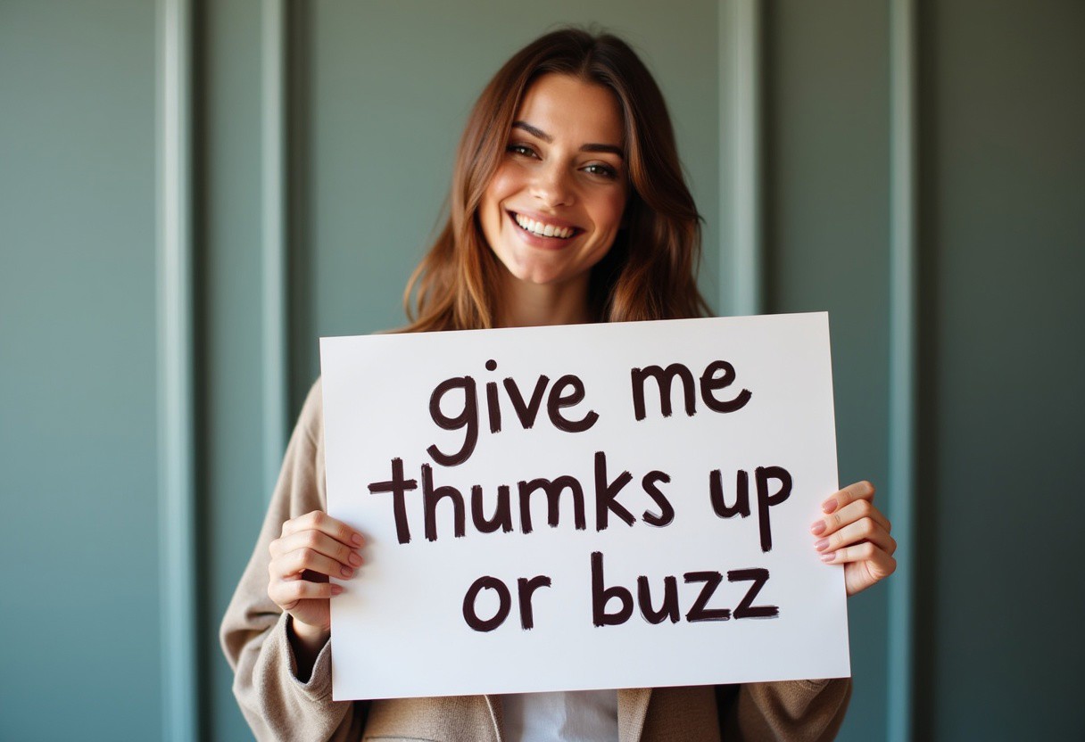 beautiful woman holding a sign it says "give me thumbs up or buzz",
