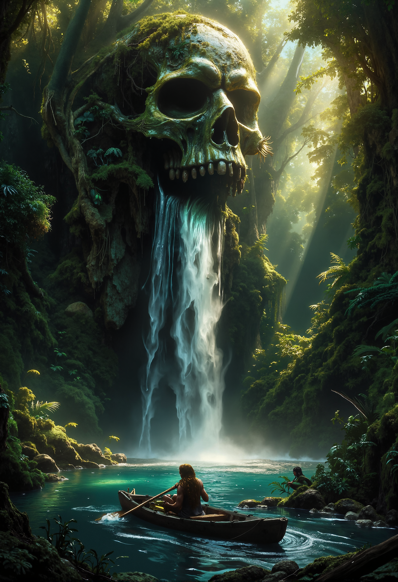 In the heart of a dense jungle, a serene lake lies beneath a cascading waterfall that pours dramatically from the gaping mouth of a colossal, ancient skull embedded in the cliffside. The skull, weathered by time, is overgrown with lush moss, vines, and ferns, blending seamlessly into the surrounding wilderness. Sunlight filters softly through the dense canopy, casting dappled light onto the scene, while the roar of the waterfall fills the humid air. On the lakeâs calm surface, an indigenous figure paddles a small, hand-carved wooden canoe, their presence adding a sense of life and mystery to this forgotten, primordial place. <lora:Dever_Flux_Enhancer.safetensors:0.5>, <lora:Magic_of_Art_\(FLUX\).safetensors:1.0>, <lora:aiai-Glimra-Flux-Dev-v2.safetensors:0.7>, <lora:DarkCore-000003.safetensors:0.5>,