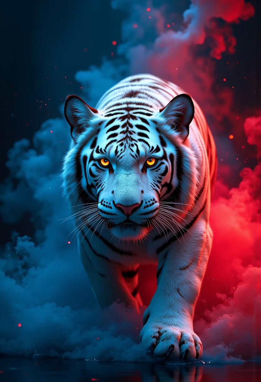 photorealistic, bokeh, shot in the water, image showing a white tiger from the front on a background of smoke in blue and red colors, the tiger's eyes glow and look at the viewer, atmospheric haze, moody lighting <lora:FluxMythP0rtr4itStyle:0.6> mythp0rt <lora:aidmaMJ6.1v0.4:0.6> <lora:Elden_Ring_-_Yoshitaka_Amano:0.33> aidmaMJ6.1