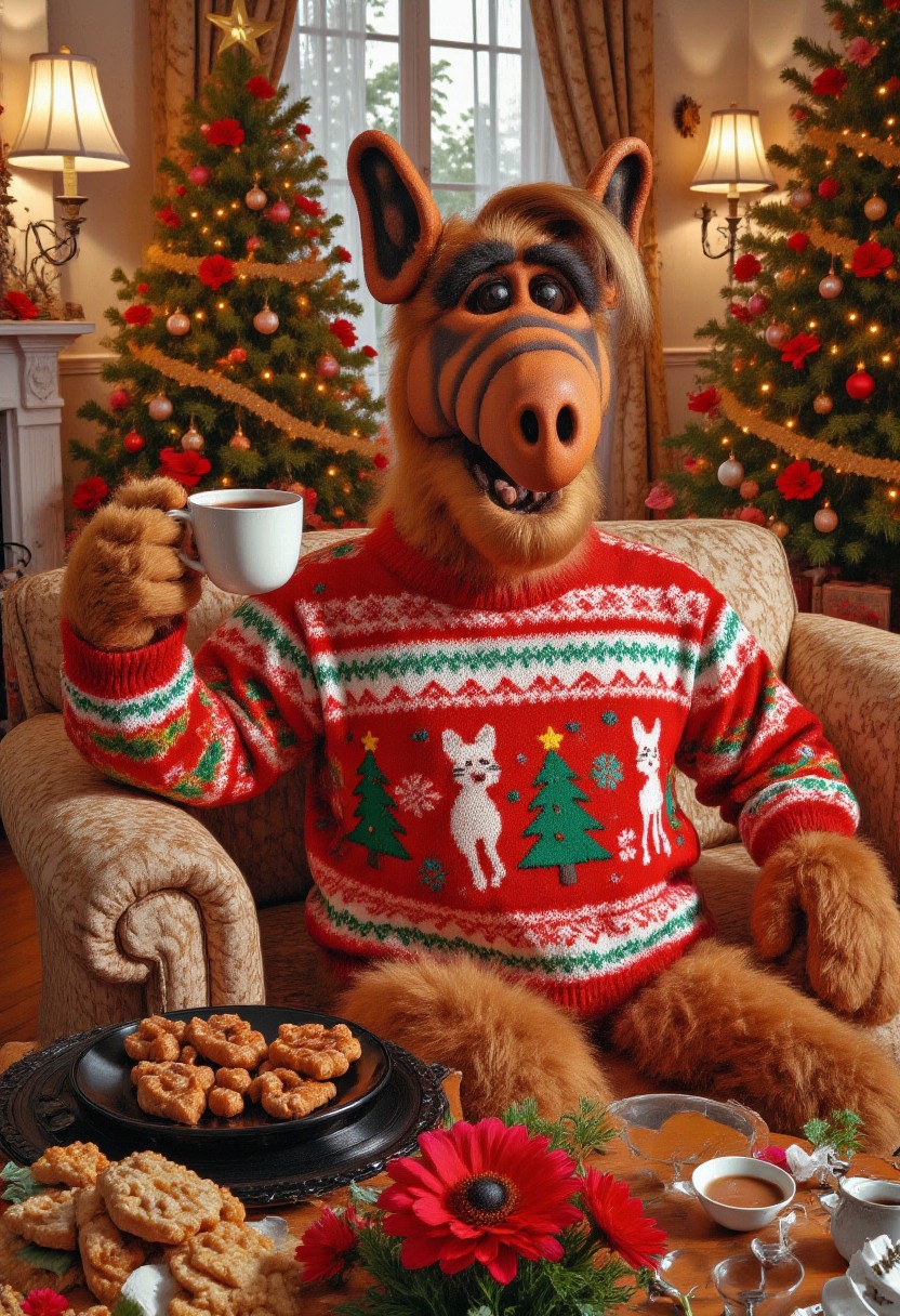 Alflux, A newly discovered animal, christmas living room, a beautiful holiday living room setting, photograph featuring ALF wearing a festive, detailed knit sweater featuring cats, ALF is sitting on the couch by the fireplace drinking a cup of warm cocoa