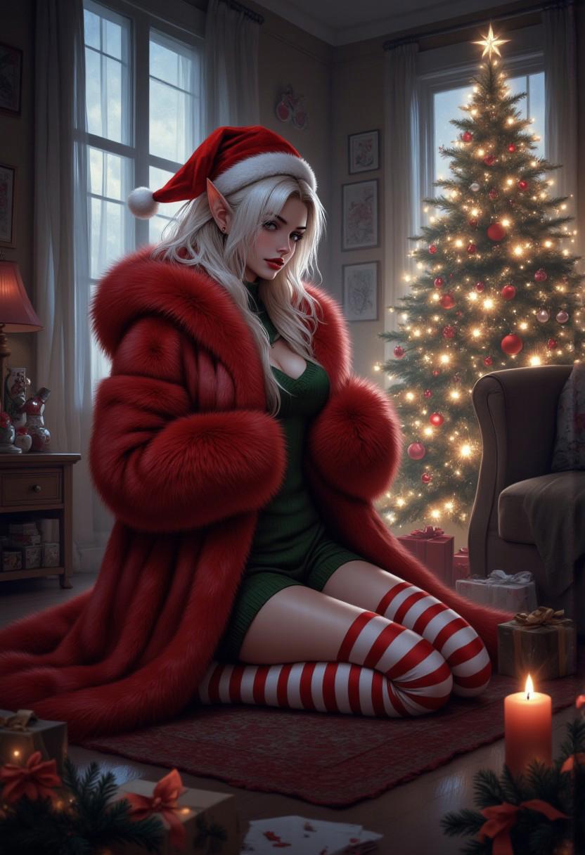 a moody, smooth and dramatic oil painting of a young woman kneeling on the floor in a room, she is wearing a Santa hat, she has long white hair and elf ears, a massive red fur coat with a fur hood, a green sweater and red and white striped tights, in the background you can see the room illuminated by a Christmas tree, the room has Christmas decorations and gifts under the Christmas tree, ample breasts, visible brushstrokes, atmospheric haze, pastel palette, low key, moody lighting <lora:FluxMythP0rtr4itStyle:0.6> mythp0rt <lora:aidmaMJ6.1v0.4:0.6> <lora:Elden_Ring_-_Yoshitaka_Amano:0.33> aidmaMJ6.1