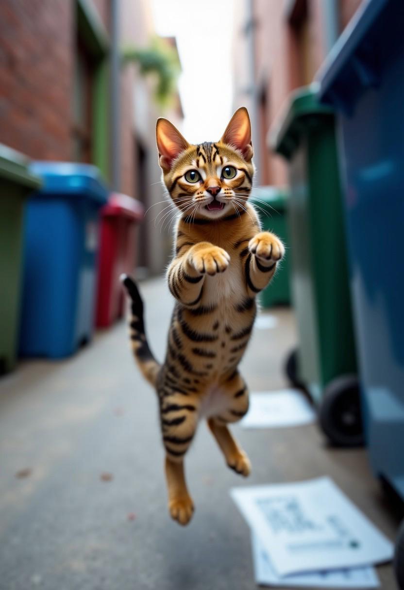 a bengal cat is captured mid-air, leaping straight up from where it was originally standing. Its body is fully extended, with its legs stretched out beneath it and its paws reaching for the air. The cat's fur, soft and slightly tousled, gives a sense of motion as it soars upward, its tail arcing gracefully behind it. Its wide eyes are filled with focus and excitement, as though it’s chasing after something just out of reach. the cat is in an alley with trash cans and papers on the ground. The background is a blur of motion, emphasizing the cat's impressive jump, while its surroundings remain sharp and clear, showing the space from which the cat is leaping. The cat’s posture exudes energy and curiosity, capturing the pure, spontaneous nature of its action