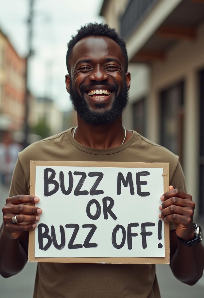 funny looking laughing dark skinned man holding a sign it say "buzz me or buzz off"