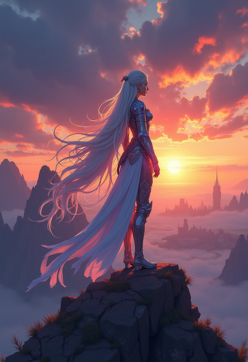 A digital anime artwork in the style of cklg. A noble warrior princess clad in iridescent armor stands atop a crystal-studded mountain peak, her gaze distant yet fierce. Her armor, encrusted with rubies and delicate celestial engravings, catches the light of dawn, casting a faint rainbow glow around her. Her long, pure white hair flows in the wind, and the silhouette of her dragon companion is set against the setting sun. The sky above is a swirl of dawn colors—dark orange, red, and midnight blue—illuminating a distant kingdom that stretches out below, veiled in mist.