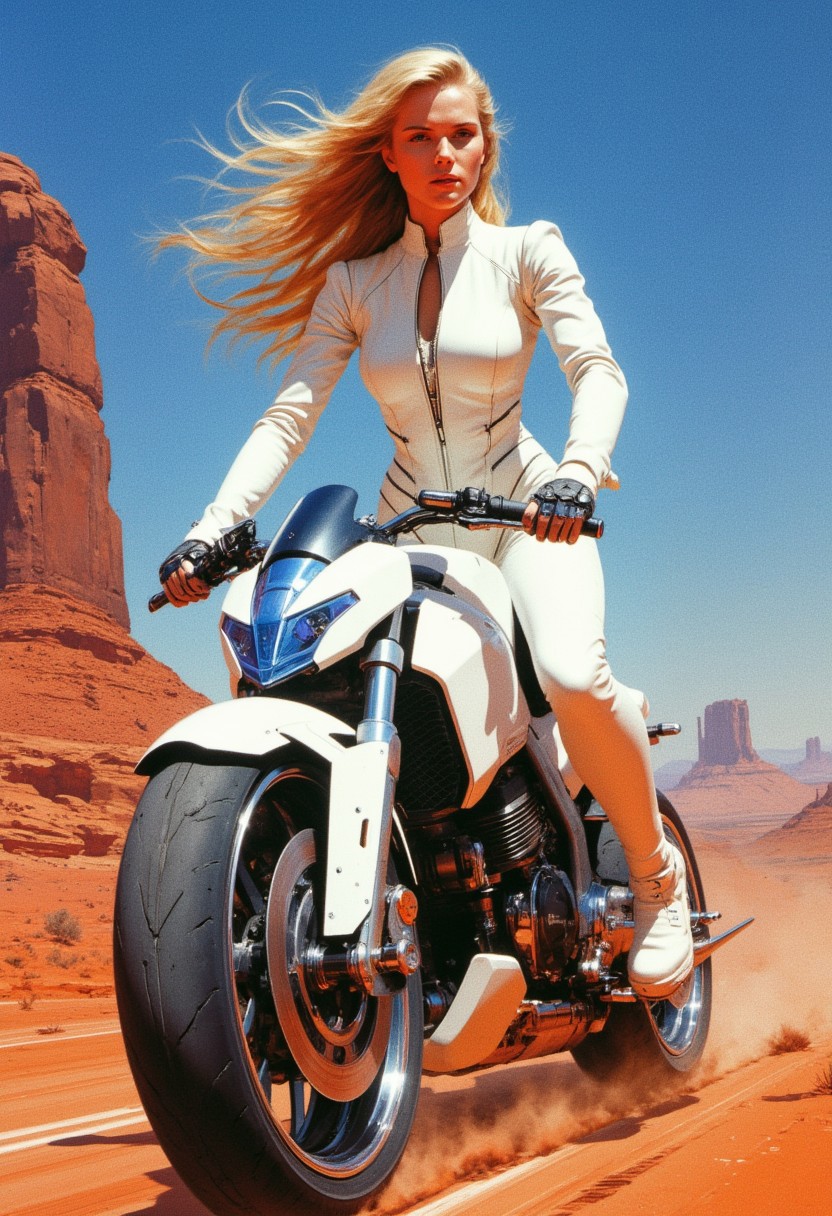 highly detailed and hyper realistic and dynamic. Highly detailed and hyper realistic high-quality photograph of a stunning blonde woman with fair skin and a slender physique, dressed in a sleek, futuristic white neoprene bodysuit with subtle blue and chrome accents. She is riding a futuristic hover motorbike, which has no wheels and is flowing elegantly in the air with the power of electromagnetism. The futuristic hovercraft is pure white with chrome elements and has a very futuristic, elegant design. The backdraft is a desert landscape with red rock formations under a clear blue sky. The lighting is bright and even, highlighting her features and the suit's details. The camera angle is eye-level, emphasizing her poised and confident stance. The overall aesthetic is very high, blending sci-fi elements with realistic textures and colors.