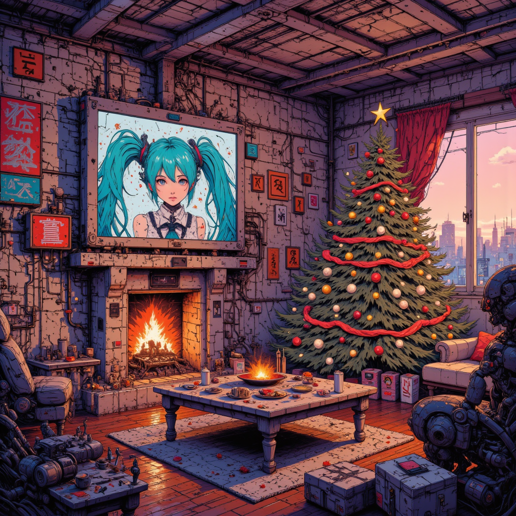 nistyle, hatsune miku as a cyberpunk cyborg girl , in a mechanical Christmas living room, anime style, looking at viewer, <lora:flux.1_lora_flyway_Epic-detail_v2:0.5> <lora:CPA:0.7> <lora:test2:0.7> , <lora:christmas living room-flux-lora:0.5>