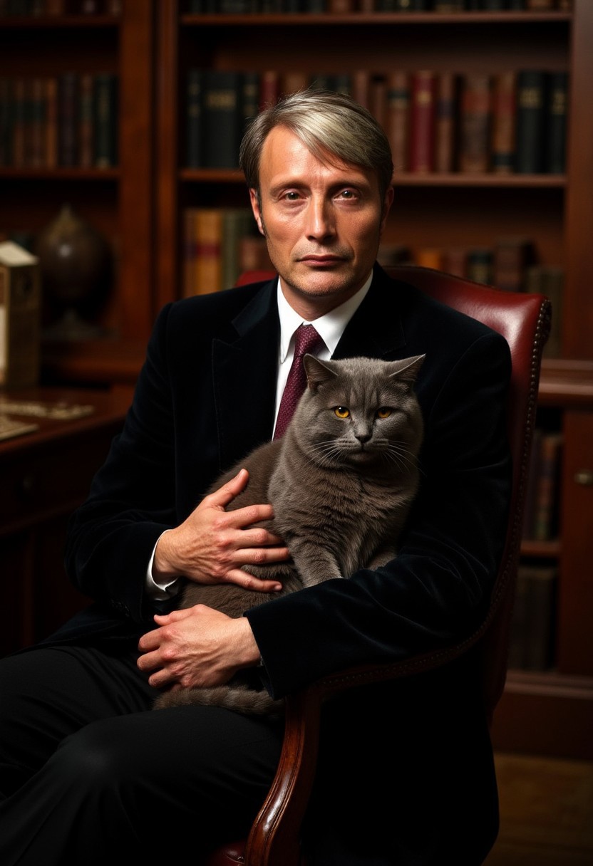 MadsMikkelsen holding a grey tabby cat, wearing a black suit while sitting in a nice leather office chair. Background of a bookshelve and a nice old style office
