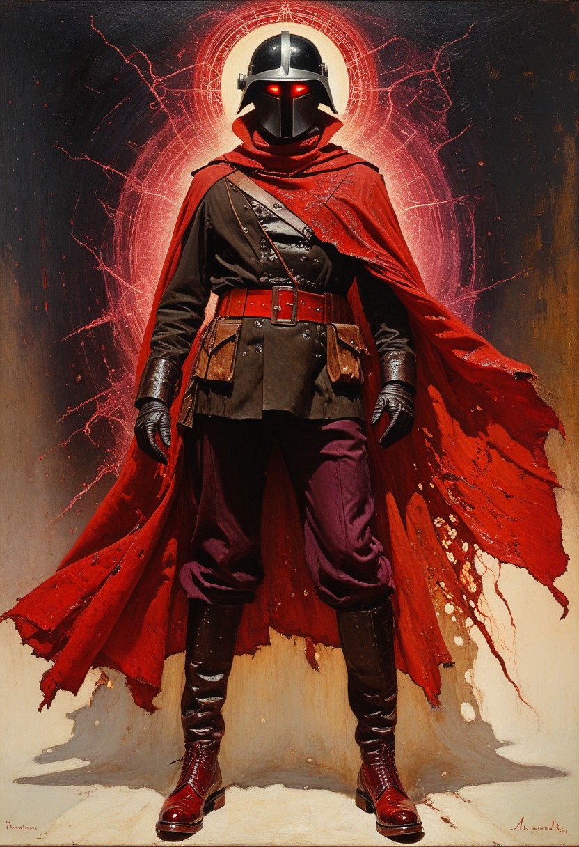 score_9, score_8_up, score_7_up,,norman Rockwell tyle, 1950s, oil painting of hand reaching beyond the view, fierce and enigmatic dark fantasy character clad in a sleek black helmet with a glowing crimson visor carved in the shape of a jagged 'T,' radiating a menacing yet alluring energy. Her tan trench coat has been transformed into a weathered, high-collared cloak adorned with arcane runes faintly glowing in scarlet, swirling with an otherworldly shimmer. Beneath it, a fitted black bodice with silver filigree and dark magenta battle-worn trousers, accented with pulsating veins of pink light, hint at a blend of mysticism and technology. A tattered, blood red scarf wraps loosely around her neck, fluttering in the wind as though alive. Her stance is powerful and commanding, one gloved hand reaching forward, her fingers surrounded by faint wisps of dark, smoky magic. church ruins backdrop: Behind her looms huge zeppelin that casts shadow over the whole scene,