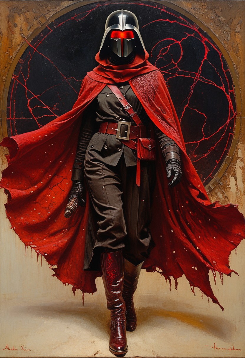 score_9, score_8_up, score_7_up,,norman Rockwell tyle, 1950s, oil painting of hand reaching beyond the view, fierce and enigmatic dark fantasy character clad in a sleek black helmet with a glowing crimson visor carved in the shape of a jagged 'T,' radiating a menacing yet alluring energy. Her tan trench coat has been transformed into a weathered, high-collared cloak adorned with arcane runes faintly glowing in scarlet, swirling with an otherworldly shimmer. Beneath it, a fitted black bodice with silver filigree and dark magenta battle-worn trousers, accented with pulsating veins of pink light, hint at a blend of mysticism and technology. A tattered, blood red scarf wraps loosely around her neck, fluttering in the wind as though alive. Her stance is powerful and commanding, one gloved hand reaching forward, her fingers surrounded by faint wisps of dark, smoky magic. church ruins backdrop: Behind her looms huge zeppelin that casts shadow over the whole scene,