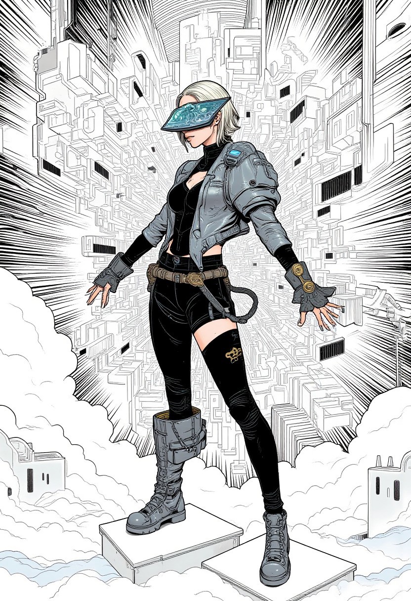 A hyper-realistic long shot of a woman standing atop a geometric pedestal, exuding confidence with one leg slightly bent and her arms outstretched, commanding the space around her. Her avant-garde outfit, inspired by brutalist architecture, features angular metallic silver and black panels with sharp, asymmetrical cutouts. A large, angular chrome silver piece resembling a shattered building fragment obscures her eyes, reflecting light with polished texture and subtle smudged light. Her short platinum mullet hairstyle complements the architectural theme. The background is a dynamic optical illusion crafted using only black-and-white linear lines in Mat Miller’s style. Bold black lines of varying thickness form a grid-like pattern, alternating between thick and thin. Some lines are angled inward, while others extend outward, creating depth. Lines converge toward the viewer, while others stretch back, making areas appear to bulge outward. The lines radiate from focal points, creating a 3D vortex effect. At the edges, the lines tighten, and in the center, they curve inward, intensifying the illusion. The high-contrast black and white enhances the depth, while the sharp linear patterns echo the architectural design of her outfit, adding a surreal, dynamic quality to the scene.