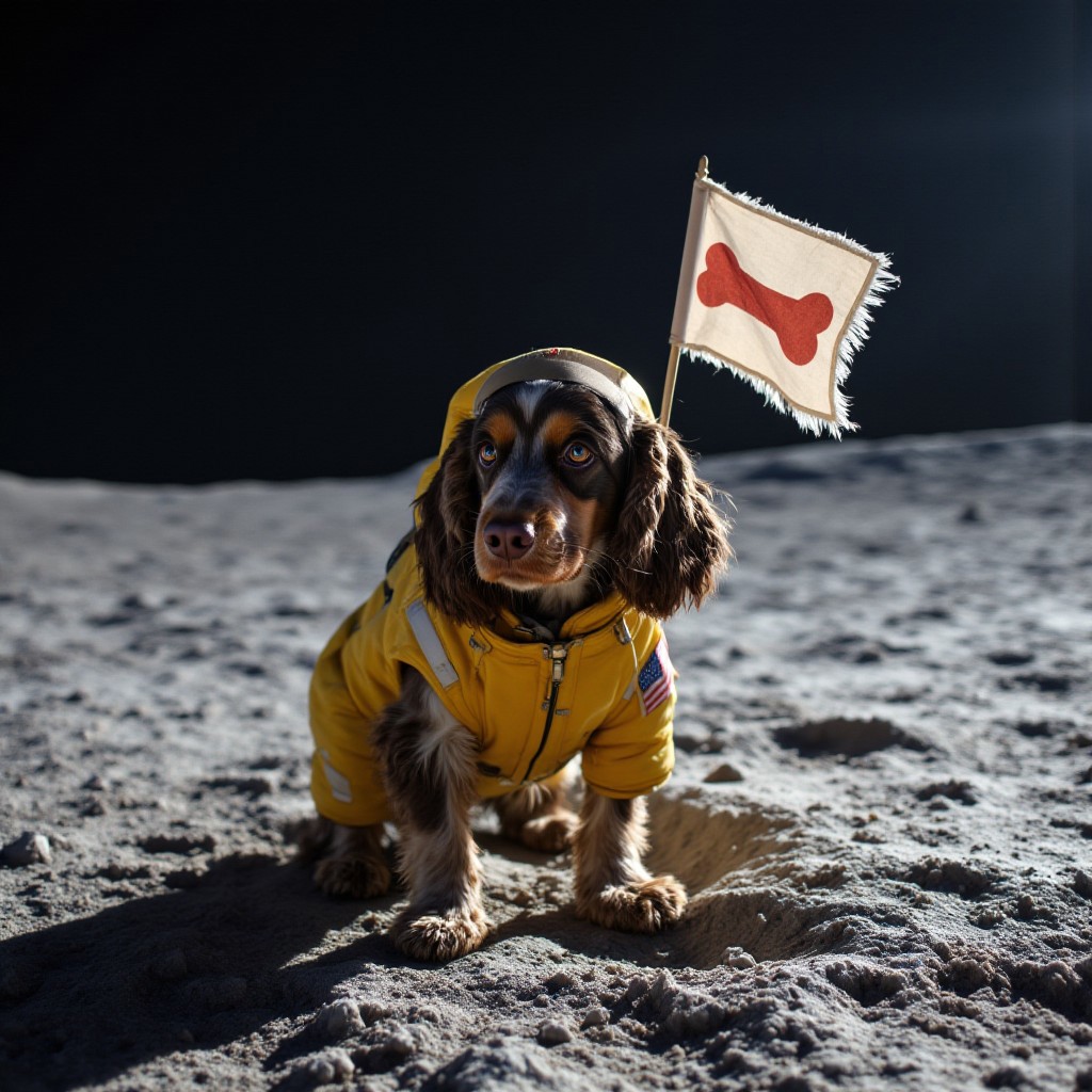 dreamdog dog wearing a spacesuit made for dogs, planting a flag with a bone on it on the moon