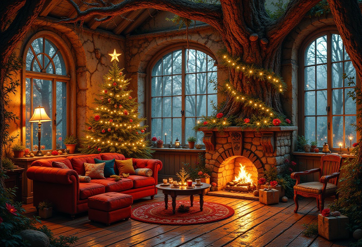 A cozy Christmas living room set in a massive enchanted treehouse, with wooden floors glowing faintly with magical runes, golden fairy lights spiraling up the trunk, and tiny mythical creatures decorating the tree while sipping hot cocoa