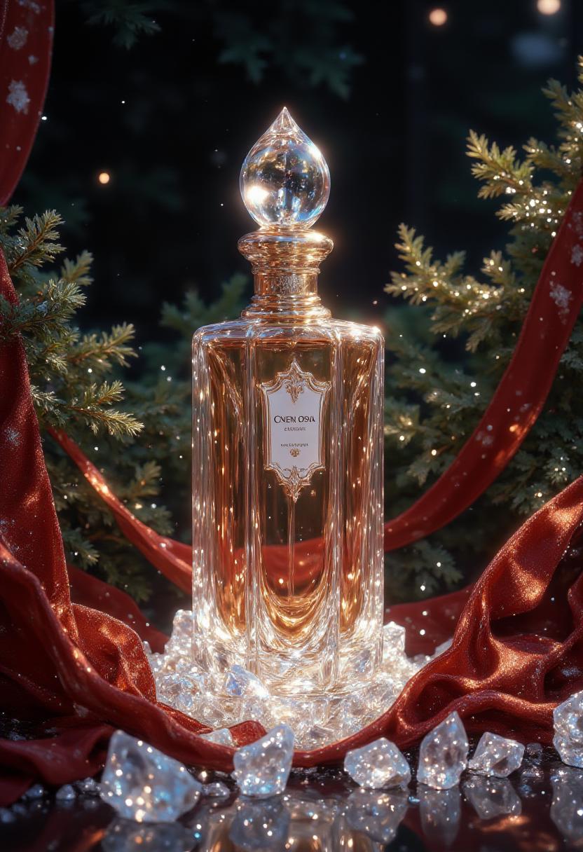 Create a perfume bottle in the center front view surrounded by sparkling ice crystals, red velvet ribbons, and frosty evergreen sprigs as shown in the reference, soft lit holiday evening background, 4k real image, hyper-realistic. <lora:Midjourney_-_SemiReal_Dreams_FLUX_LoRA:1>, <lora:PinkieEtherealMJFLUX-v2.0:1> pinketherealmj, <lora:flux.1_lora_flyway_Epic-detail_v2:1>