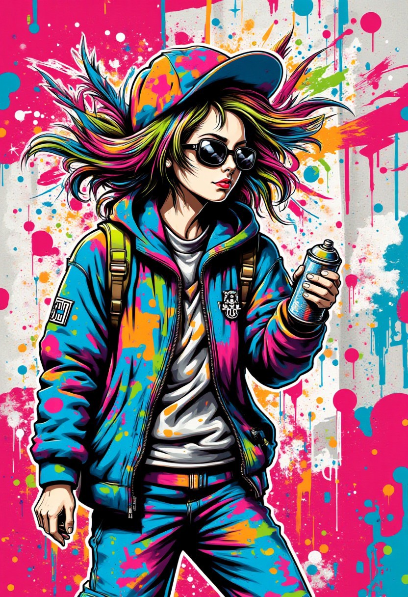 Stylized digital graffiti drawing, A vibrant poster, influenced by the pop-art aesthetic of Andy Warhol, features a female graffiti artist in action, her spray can leaving a trail of colorful chaos across a stark urban wall. Her attire is a mishmash of street fashion and her wild hair is a swirl of vibrant hues, mirroring the energy and freedom of her art. Urban art, rebellious, dynamic, pop art, illustration.