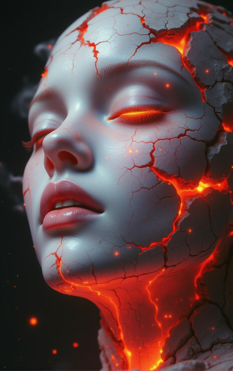 This is a highly detailed and surreal photograph featuring a realistic, cracked white human face with red-hot lava oozing from the cracks, creating a dramatic and captivating contrast. The face is depicted with meticulous attention to detail, ensuring that every nuance is rendered with precision. The face is serene, with eyes closed and lips slightly parted, adding a sense of tranquility and calm despite the surreal and dramatic elements. The cracks on the face are intricately detailed, with the red-hot lava oozing out, creating a stark and mesmerizing contrast against the white skin. The lava is rendered with a glowing, fiery quality, adding a sense of movement and life to the image. The lighting is dramatic and cinematic, with highlights and shadows that enhance the textures and contours of the face and the intricate details of the cracks and lava. The use of advanced digital techniques allows for the creation of intricate textures and realistic effects, ensuring that every detail is rendered with stunning clarity. The overall composition is balanced, with the face taking center stage, while the background elements add depth and context to the scene. The emotional intensity of the image is captivating, with the serene expression of the face contrasting sharply with the dramatic and surreal elements of the lava, creating a sense of awe and wonder. The style of the photograph is reminiscent of high-end concept art, blending elements of realism, fantasy, and surrealism to create a visually stunning and evocative image. The result is a masterpiece that captures the essence of the surreal and dramatic contrast, creating a visually stunning and emotionally resonant piece of art. <lora:111622:1> Epic Image <lora:neil-krug-flux1-dev-v1:0.45> a photo of, in the style of neil-krug <lora:Ethereal_Photography:0.45> ethereal_photography, ethereal_inuendo <lora:epic-midj:0.45>