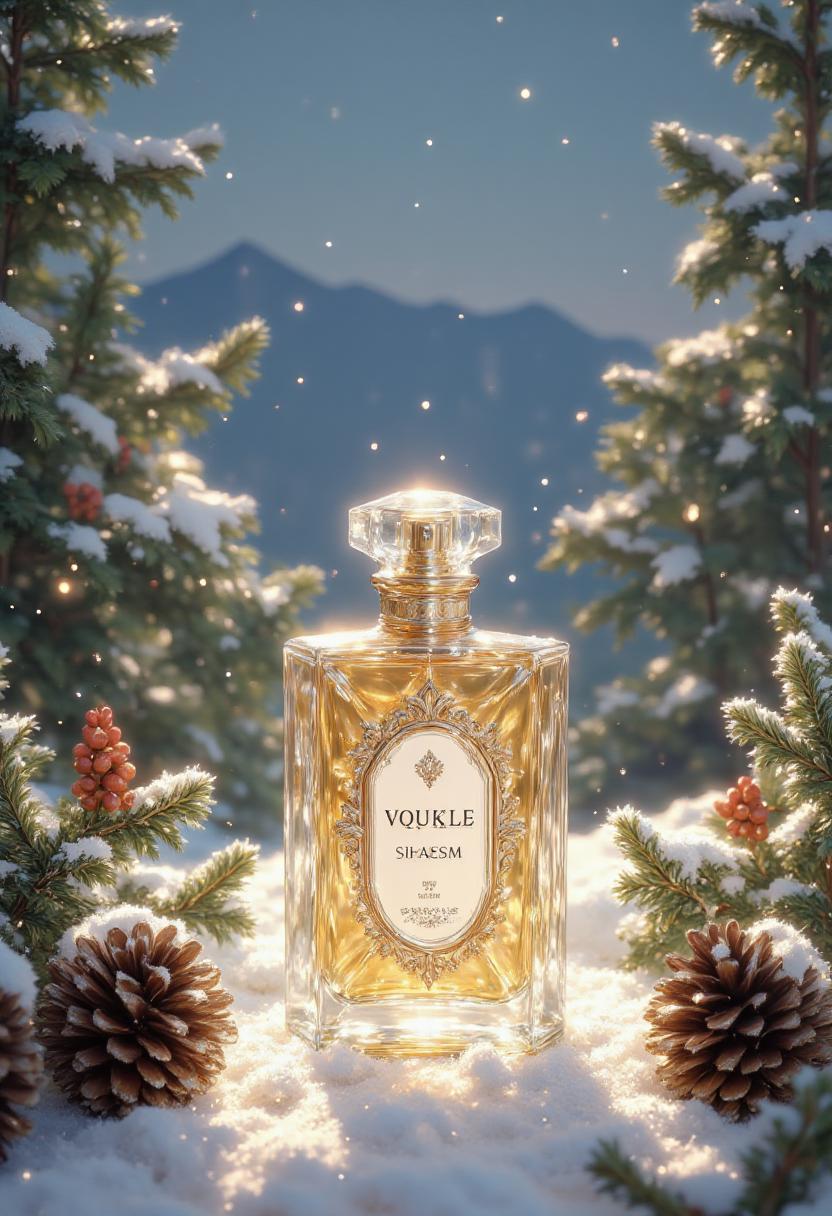 Create a perfume bottle in the center front view surrounded by pinecones, snowflakes, and holly berries as shown in the reference, snowy sky in the background, 4k real image, hyper-realistic. <lora:Midjourney_-_SemiReal_Dreams_FLUX_LoRA:1>, <lora:PinkieEtherealMJFLUX-v2.0:1> pinketherealmj, <lora:flux.1_lora_flyway_Epic-detail_v2:1>