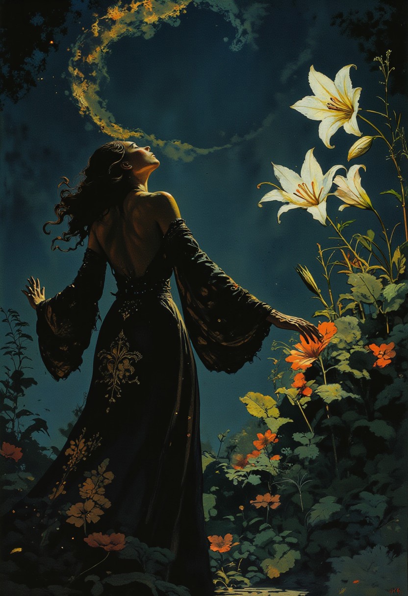 A mesmerizing oil painting inspired by the ethereal surrealism of Maxfield Parrish and the dramatic elegance of John Singer Sargent, depicting a woman with long, wavy hair cascading down her back, standing in a graceful yet commanding pose against a deep, immersive blue background. Positioned slightly off-center, her head tilts back subtly, her arms outstretched with delicately splayed fingers, emanating serene intensity and quiet strength. She wears an elegant, flowing dark gown with wide, sweeping sleeves, its textured richness rendered in intricate, expressive strokes, creating a striking contrast against the vibrant, luminous backdrop. To her right, a cluster of large white lilies in full bloom is painted with a Parrish-like delicacy, their translucent petals glowing under a soft, celestial light that bathes the scene. A radiant backlight defines her silhouette, accentuating her poised form and casting subtle shadows across her gown, highlighting Sargent’s influence in the interplay of light and fabric. The deep blue background envelops the composition, amplifying the surreal tranquility of the piece, while the luxurious texture of her attire contrasts harmoniously with the delicate luminosity of the lilies. The overall scene conveys a profound sense of calm, mystery, and divine elegance, blending timeless artistic traditions with a surrealist dreamlike quality. HD, 8K quality, ultra-detailed, masterpiece artwork, flawless anatomy.