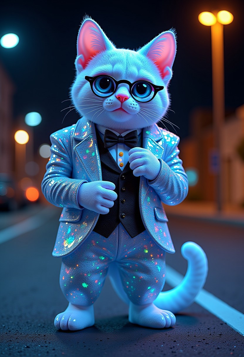 professional photography of a cat made of opal, wearing tuxedo, black eye glasses and holding a gun, in a parking lot, elaborate fantasy style art, very colorful, intricate details, ultra sharp, exquisite detail, flawless composition, vivid colors, masterpiece, exciting background, a 3d text across screen saying "John Kitty" in a stylish font,