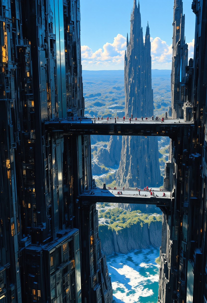((ne0nfant4sy, mythp0rt)), A hyper-realistic image, Seen from above, seen from front, Perfect smooth illustration, ultra detailed, hyper realistic. 4K 8K 16K 32K. « With a luminous arrow the book indicated a group of crystal towers built in vertiginous shapes. Bridges of black glass link the towers to one another, and fair maidens enjoy a peaceful walk thereupon, gazing at the river below. »» nt4sy, midjourney_whisper_avant_couture