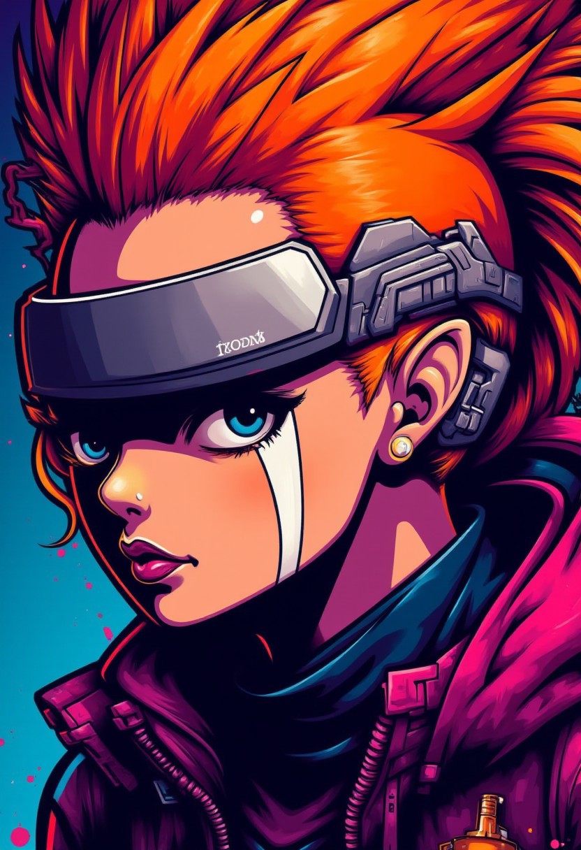 Create a vibrant, stylized digital artwork featuring a close-up of a futuristic, stylized female face. The subject's hair is depicted in a stylized, exaggerated manner, styled in a high, spiky fashion with an orange hue, giving it a bold, futuristic look. She has a striking, angular face with sharp features, highlighted by a white stripe across her cheek. She is wearing a metallic headband or visor that frames her face, adding to the futuristic aesthetic. The colors are bright and bold, with a high contrast that enhances the futuristic feel. The background is a gradient of deep purples and blues, adding depth and a sense of mystery. The overall composition is dynamic and eye-catching, emphasizing the subject's powerful and futuristic presence.