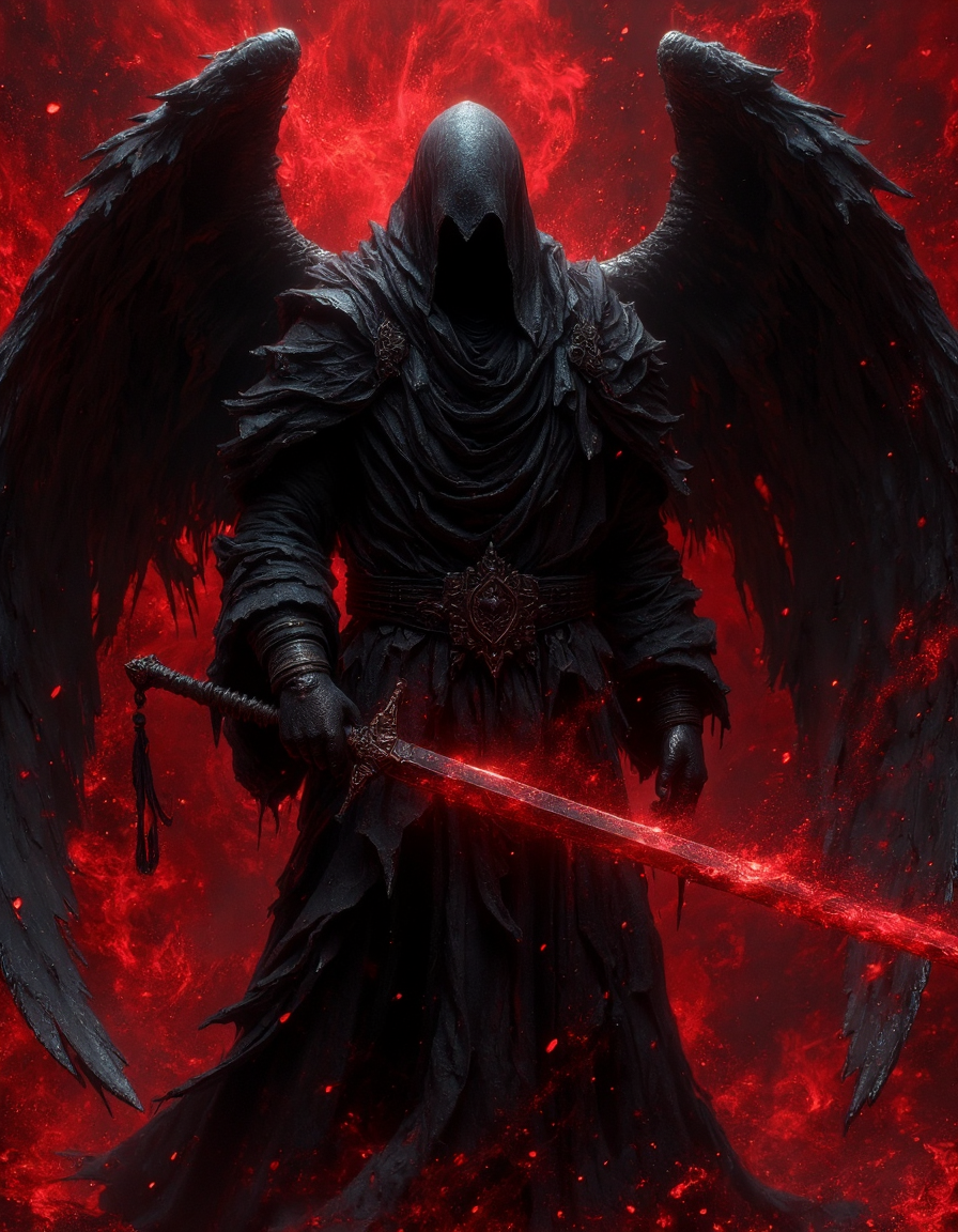 highly detailed cinematic scene, Dark, stylized figure with large wings, holding a long, blood-red sword. Imposing figure of a dark entity, shrouded in dark, textured wings. Vigorous, dramatic sword thrust, with rich black hues reflecting the intense red lighting. Intense, dark and chaotic environment, with swirling and splattered dark, blood-red hues. Extreme close-up perspective on the figure and weapon, emphasizing details. Abstract, expressive style; painterly strokes and texture create a dramatic, visceral impact. Aggressive, violent subject, conveying a powerful and emotive mood. Atmospheric and moody style, evoking feelings of danger and ominous power. Dark, painterly, and layered, with contrasting dark and red tones against a background of blood-red and black splatters. High contrast, emphasizing the contrast between the black figure and the red surroundings, shallow depth of field, vignette, bokeh, moody, epic, gorgeous, film grain, grainy, hkmagic, <lora:FantasyWizardWitchesFluxV2-000001:0.9>, <lora:Dever_Flux_Enhancer:0.4>, <lora:Elden_Ring_-_Yoshitaka_Amano:0.4>