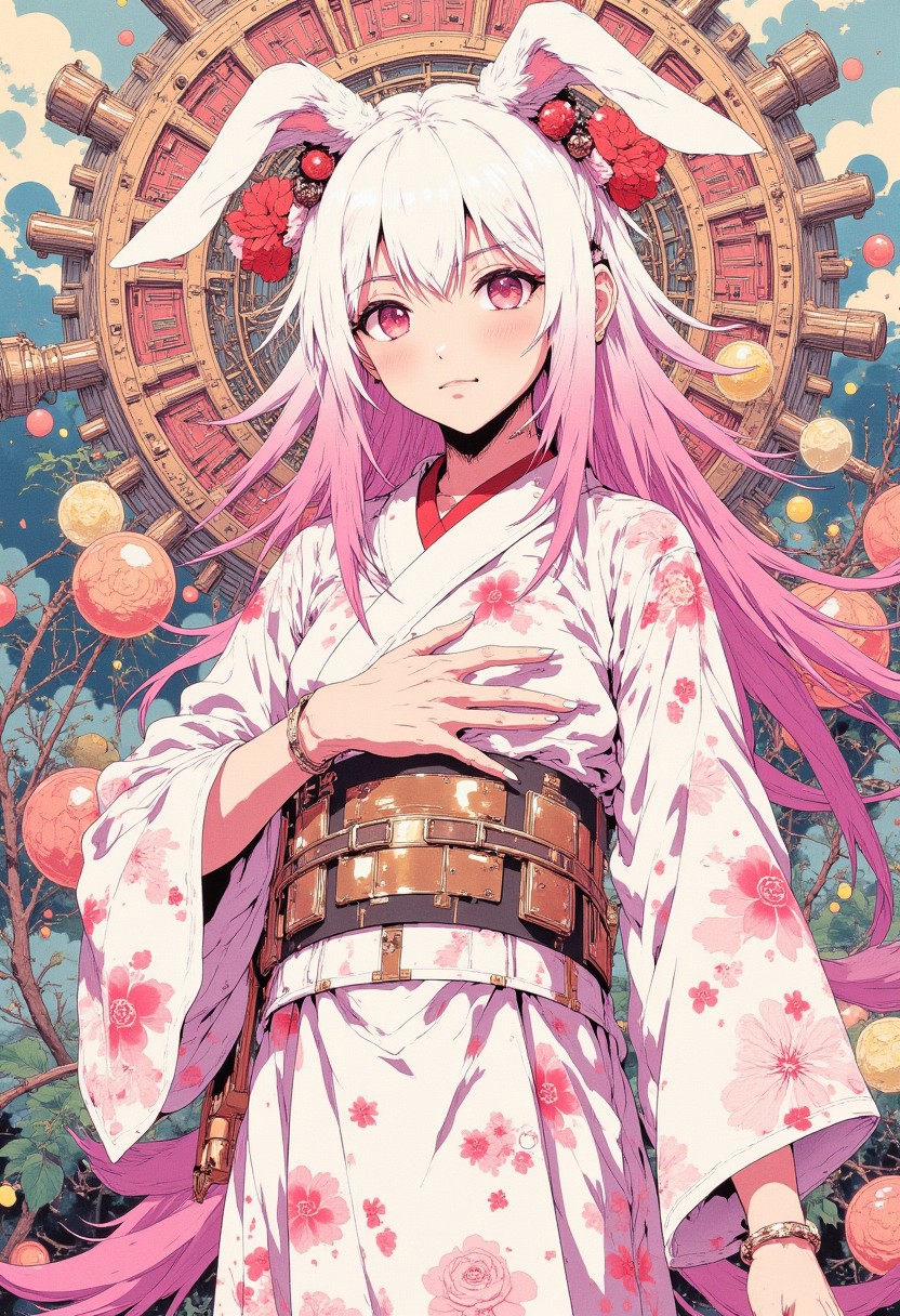 Neo Art Style, A Japanese girl with long rabbit ears and gradient white-pink hair wears a floral white furisode. She embodies Neo-Japan futurism, surrounded by a surreal, intricate futuristic background.CAICO