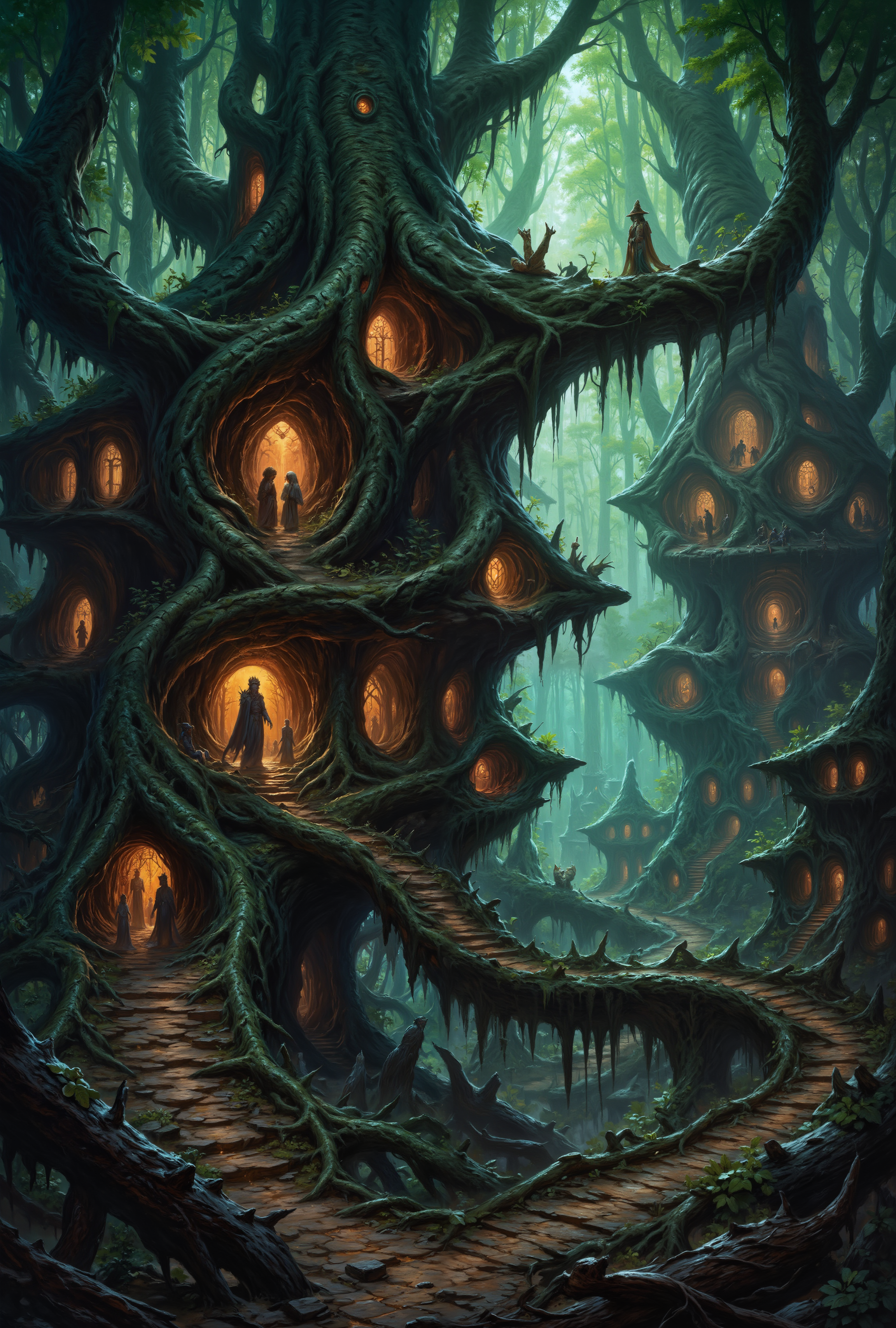 An ancient forest where massive tree roots form natural architectural structures, elvish-style dwellings carved into living trees, soft ethereal light filtering through dense canopy, mystical creatures partially visible, Fantastic lighting. Detailed shadows.intricate details, vivid colors, hyper-detailed, ultra-sharp, mtg <lora:MTG_-_FLUX:0.65><lora:FluxDFaeTasticDetails:0.5><lora:detailed_v2_flux_ntc><lora:RetroAnimeFluxV1:0.2><lora:Aura_Flux-000010:0.3><lora:Flux_Fantasy_Portraits:0.5>