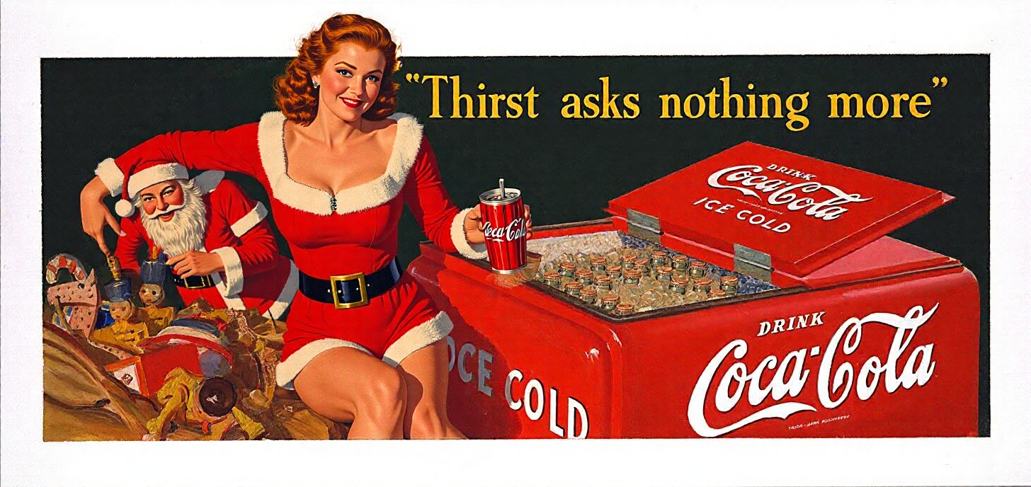vintage illustration of a (sexy woman) (dressed as santa:1.35) (drinking:1.05) a (coke cola:1.35)