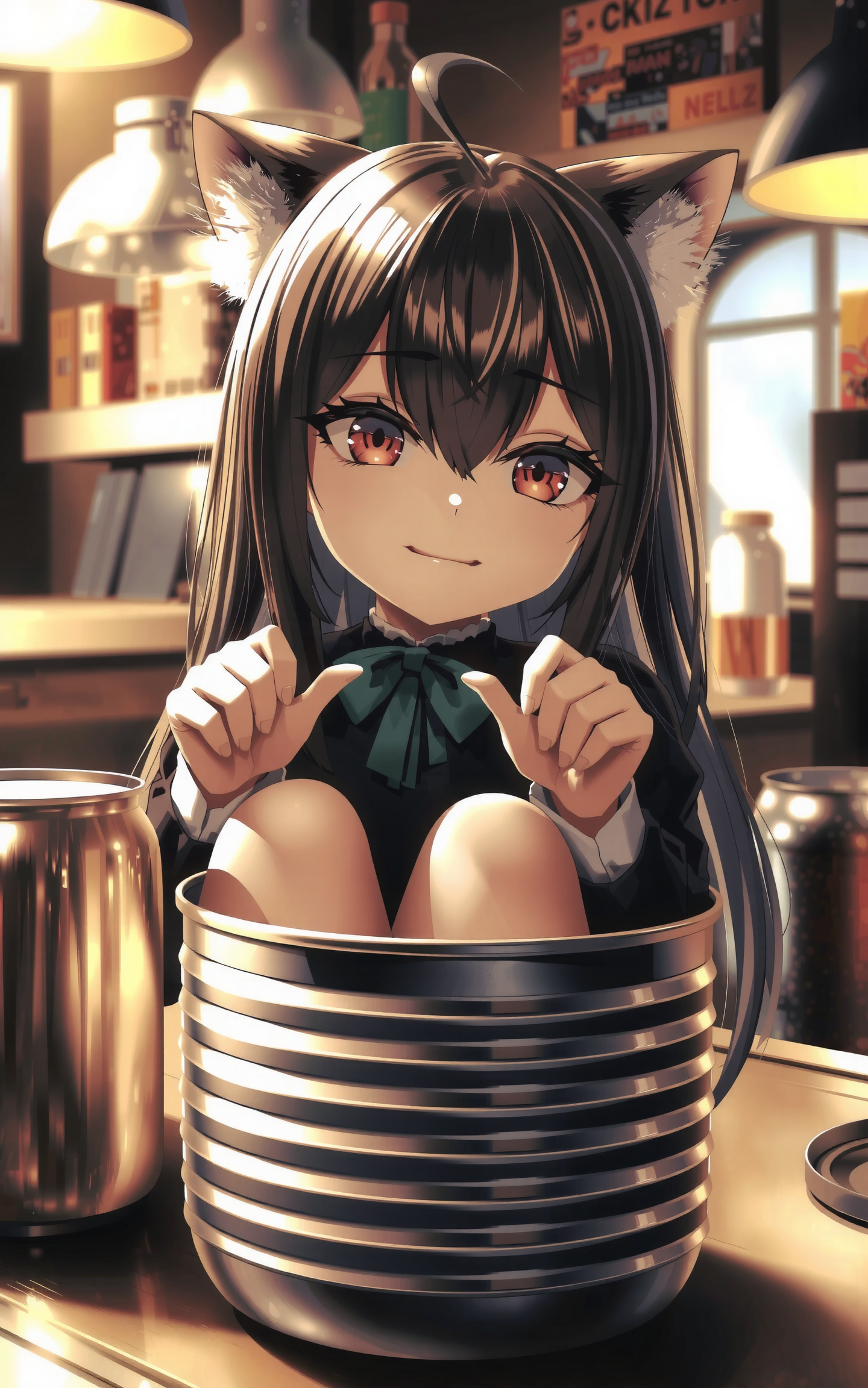 Animation style, A cheerful cat-eared anime girl sitting snugly in a shiny tin can, looking at the viewer with a playful and endearing expression. Her hands are positioned in a cute gesture, her detailed outfit blending modern and fantasy styles. The scene is illuminated by warm, soft light, with realistic reflections on the can and high-definition details on her hair and ears. <lora:aidmaMJ6.1v0.4:0.8> aidmaMJ6.1
