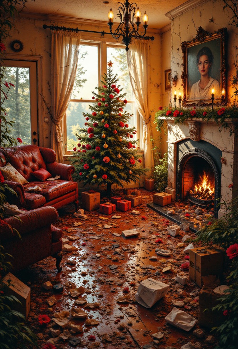 christmas living room, messy, garbage, trash, low light, stink, beer cans, dirt, mud, beer bottles
