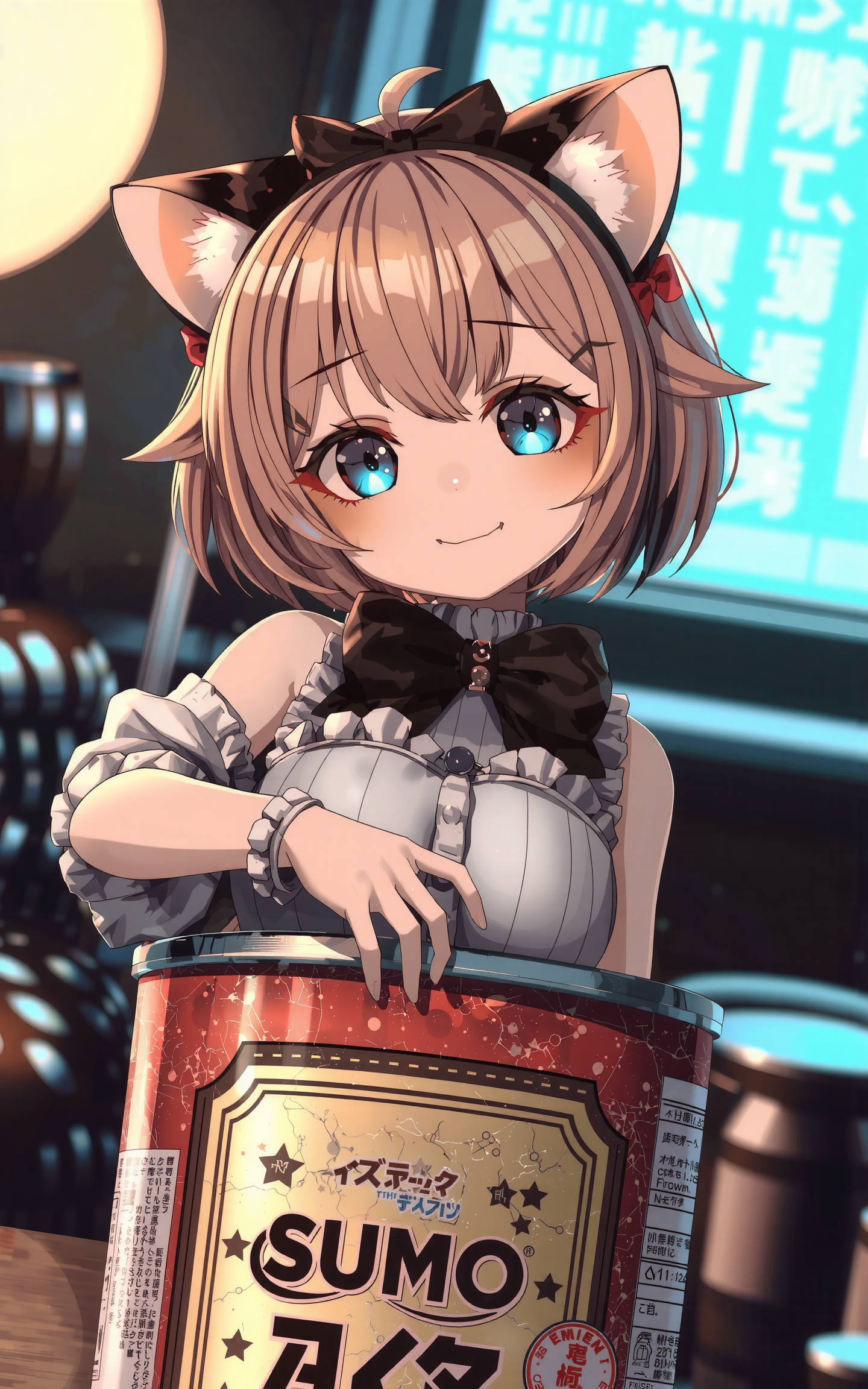 Animation style, An anime-style catgirl perched inside a metallic tin can, with no text on it, giving a kawaii pose towards the lens, her fluffy ears twitching. Her big, sparkly eyes and charming smile draw attention, with intricate details on her outfit that reflect a soft pastel theme. The tin can has scratches and embossed labels for added realism. Artistic lighting, ultra-realistic textures, and a fantasy-like glow around her. <lora:aidmaMJ6.1v0.4:0.8> aidmaMJ6.1
