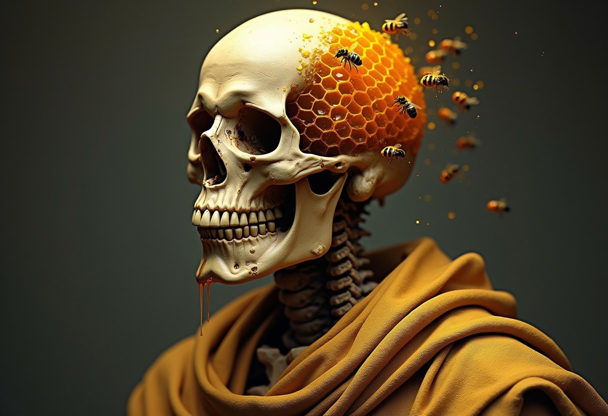 A human skull with a honeycomb and bees, dripping golden liquid honey on the head of an ancient skeleton in flowing robes, in the style of fantasy art, high resolution, hyper-realistic.