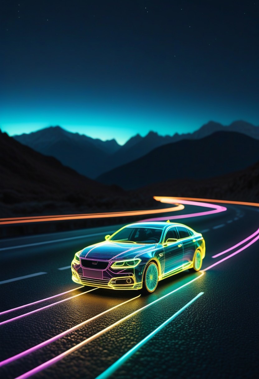 car made of tiny neon glass filaments, on the road, at night, neon glowing in the asphalt, motion blur, mountains at the distance