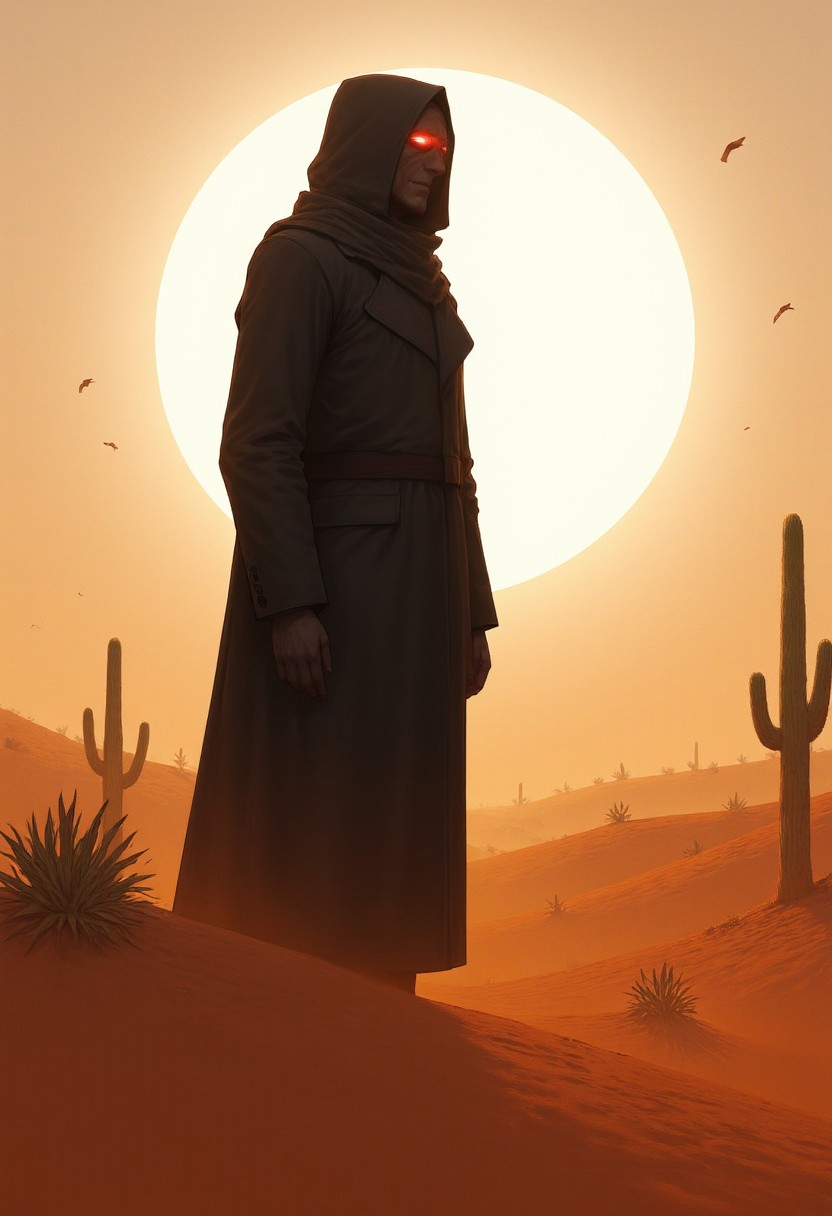 In a Shimmering landscape, a towering figure dressed in a black suit and One-Eyed stands on the edge of Meera African desert, aidmaIllustriousStyle