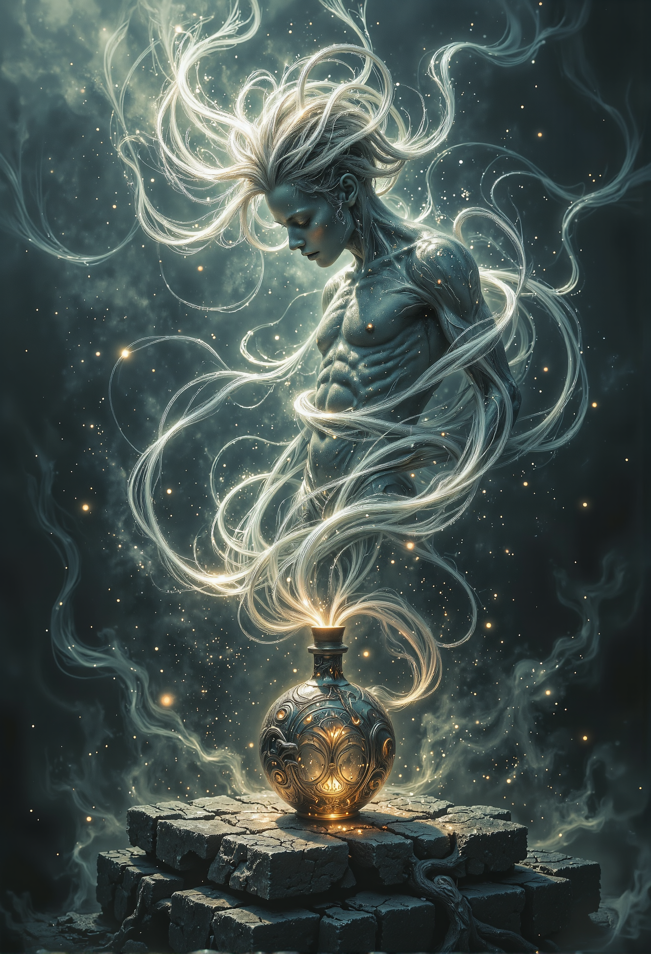(disintegrating and dissolving into fog and smoke:1.9), (blending form with reality:1.9). Framed in thick volumetric fog. diffused light, delicatly, whispering, eye catching masterpiece artwork. drifting fog, cracked light and scattering smoke in a dreamlike reality. A mystical genie emerges in a swirling, spectral form, its translucent body shifting like liquid smoke, blending seamlessly into the surrounding mist. Its faint facial features are ever-changing, exuding an aura of both power and mystery, while its flowing arms and torso twist gracefully in the air. Below, a mystical genie bottle rests on an ancient, cracked stone pedestal, its surface ornately engraved with intricate patterns of gold and emerald. From the bottleâs narrow neck, the genieâs essence continues to flow, disintegrating into fog that mingles with the thick, volumetric mist enveloping the scene. Diffused light filters through the haze, scattering across the air in mesmerizing beams, casting an enchanting, dreamlike glow as the genie hovers above, an embodiment of otherworldly allure. <lora:flux_sparklycism.safetensors:0.5>, <lora:The_Dark_Side_Of_The_Future.safetensors:0.33>, <lora:aidmaGLOW-FLUX-V0.1.safetensors:0.3>, <lora:midjourney_whisper_flux_lora_v01.safetensors:0.5>, <lora:zhongfenghuaStyle_FLUX_ Lora.safetensors:0.5>, <lora:Midjourney_-_SemiReal_Dreams_FLUX_LoRA.safetensors:0.5>,