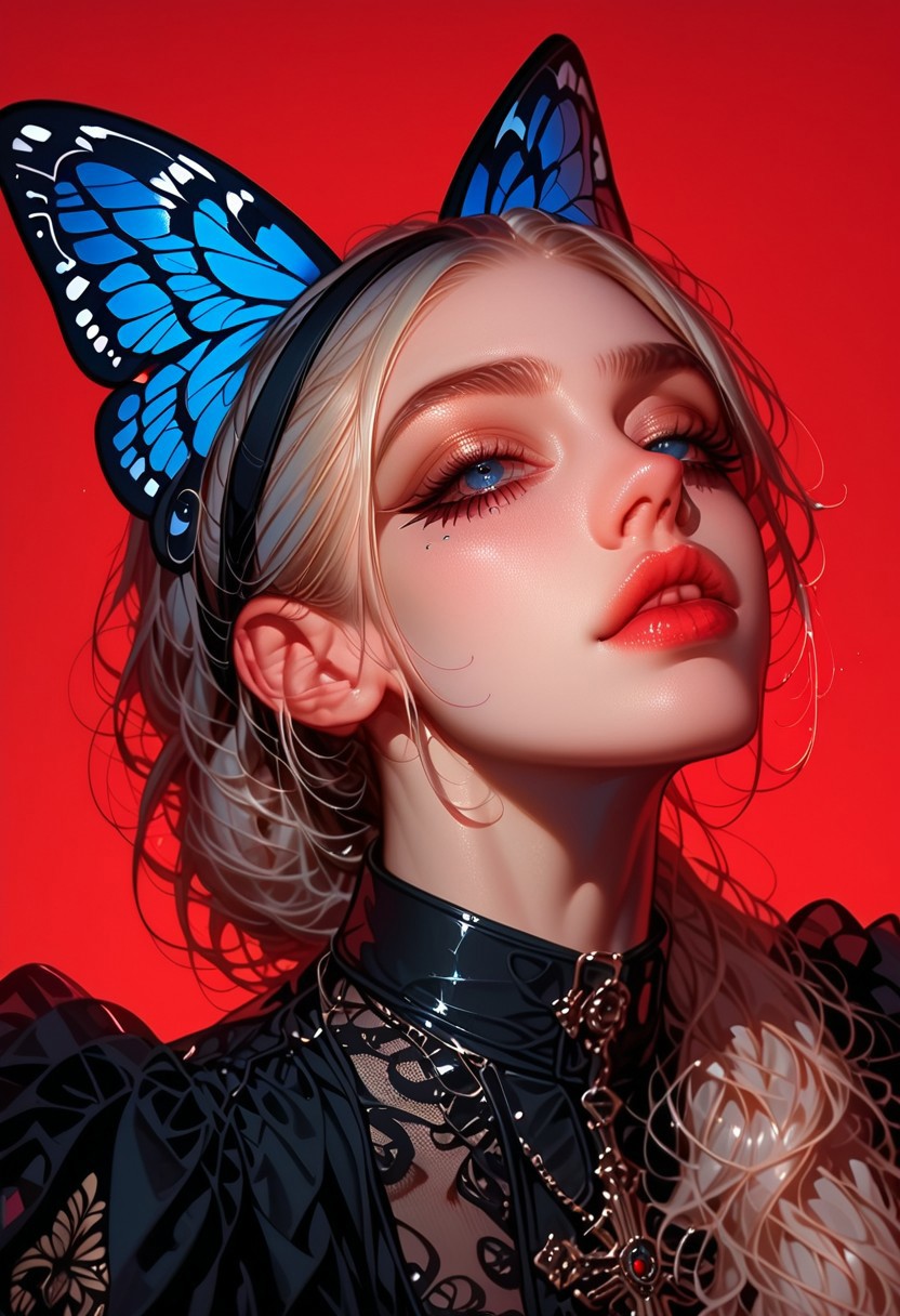 (photograph:1.4), (beautiful woman:1.6), (fair skin:1.5), (long blonde hair tied back:1.6), (blue eyes:1.5), wearing a (black feathered necklace with butterfly motifs:1.7), (looking directly at the camera:1.5), with a (serious expression:1.4), (bright red background:1.6) creating a (striking contrast:1.7). (Butterflies in various sizes and colors:1.5), including (orange:1.4), (black:1.4), and (white:1.4), are (attached to her hair and necklace:1.6). (High key lighting:1.5), (even illumination:1.4), no (harsh shadows:1.3). (Close-up shot:1.5), (medium angle:1.4). (Very high aesthetic quality:1.6), (fashion photography:1.5), (editorial style:1.5). The image has a (surreal:1.5), (artistic feel:1.4), with an emphasis on (texture:1.5) and (color contrast:1.6). [unwanted noise:0.3], [oversaturation:0.2], score_9:1.2, score_8_up:1.1, score_7_up:1.0, High quality rendering.