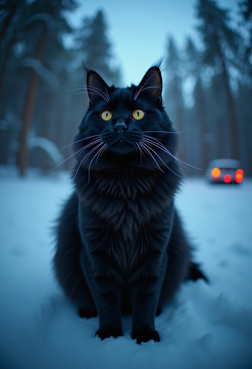 cinematic photo (extreme wide-angle fisheye camera:1.9), (black cat:1.1), (((MaineCoon))), (((long shiny winter coat))), black-grey cat, winter night, snow, forest, (neon line art:0.9), realistic, 35mm photograph, film, bokeh, professional, 4k, highly detailedб Maine_Coon