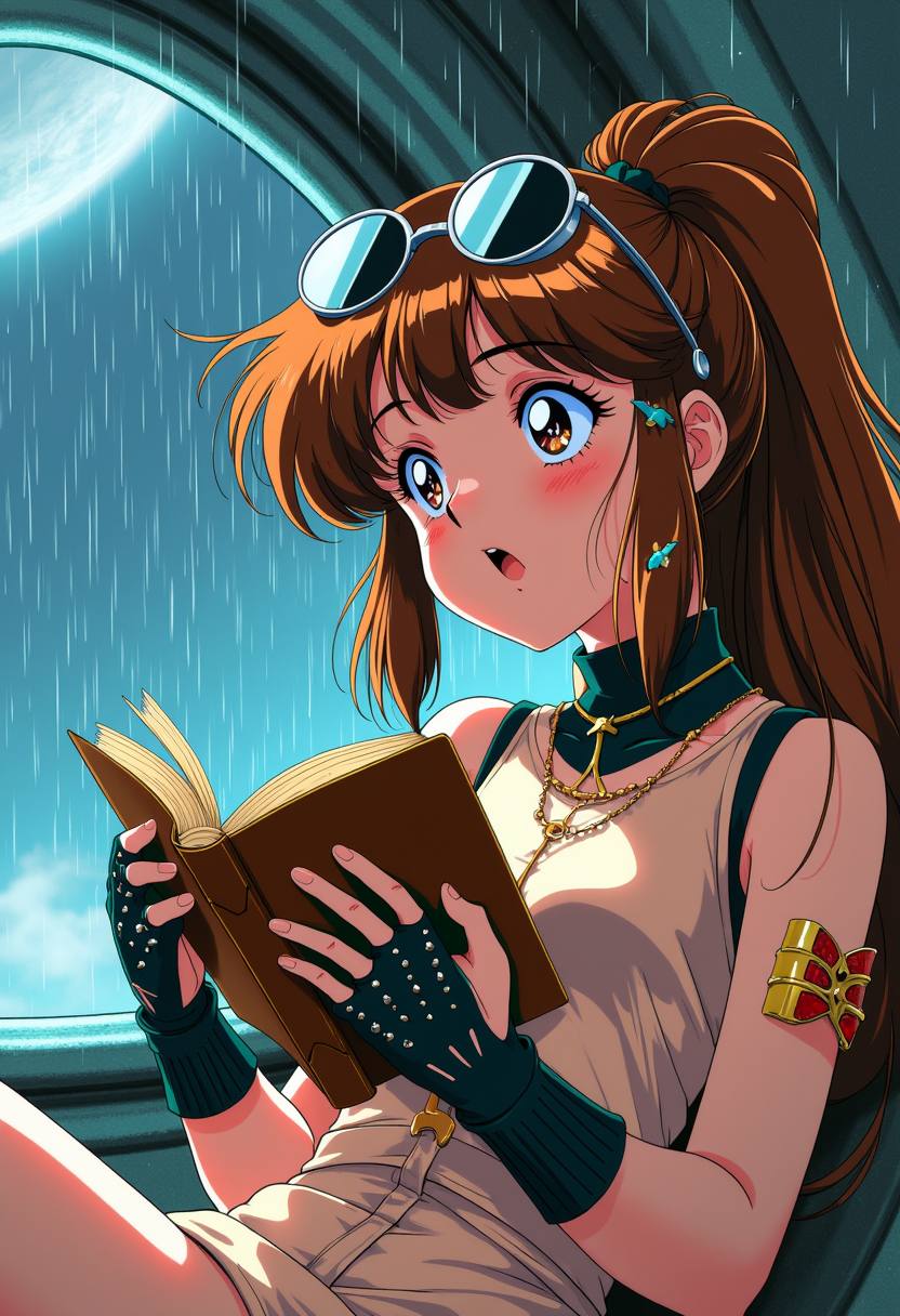 1girl, Retro style anime girl reclines on a sleek, shimmering starship interior, her long hair styled in a high ponytail adorned with tiny, sparkly clips. Her fingers peek out from gloves with intricate, finger-shaped cut-outs, grasping a worn leather-bound book. A hint of asymmetry in her cut adds a touch of whimsy, while round sunglasses perch on her nose, giving her a laid-back, retro vibe. Suddenly, raindrops suspended mid-air as if time itself has frozen, leaving our heroine open-mouthed in shock, her expression a perfect blend of surprise and wonder, modernretroanime.