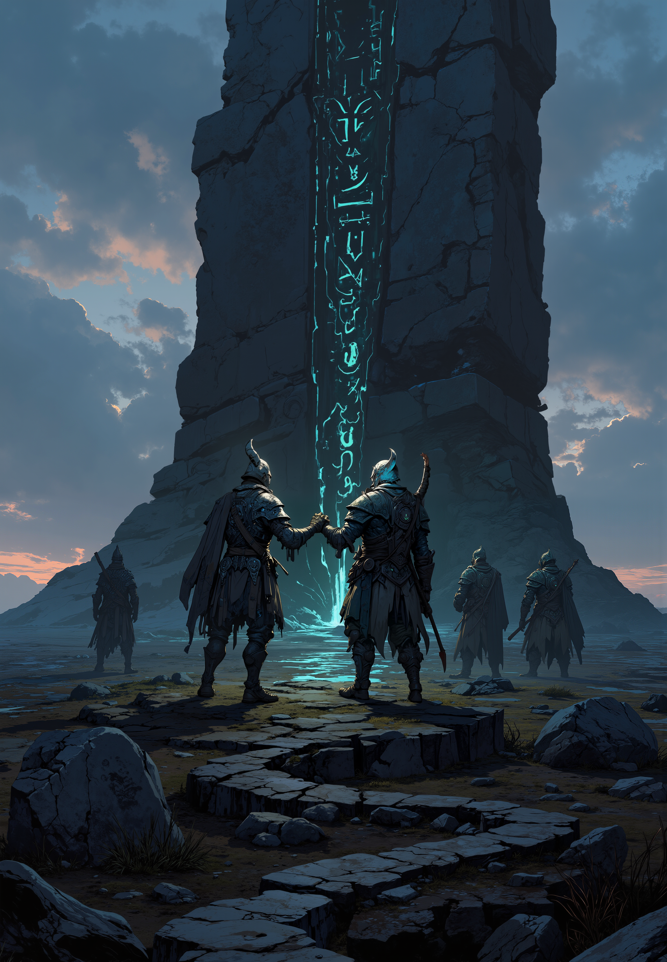 On the barren, windswept plains, a massive stone monolith juts out of the ground, ancient runes carved into its surface glowing faintly in the twilight. A group of travelers stands at its base, each with worn cloaks pulled tight against the relentless winds. One among them, wearing intricate armor with glowing veins of light running through it, steps forward and places a hand on the stone. As they make contact, the runes pulse with energy, and the ground beneath them begins to shift, revealing a hidden pathway leading deep into the earth.<lora:Anime v1.3:1.2>