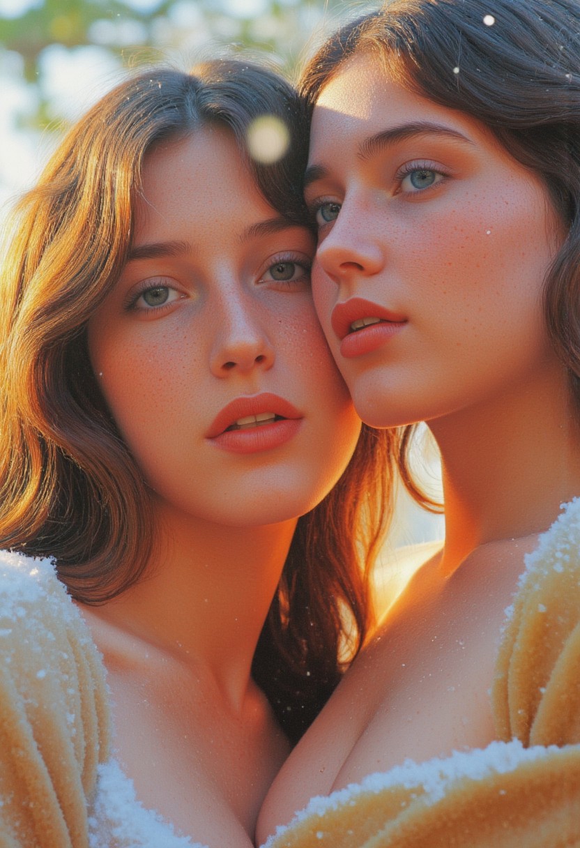 A realistic, intimate close-up of a Woman in fluffy bodysuit and a soft, clumsy woman, their adorable bodys framed in perfect harmony. The wimens round, curious breasts glisten with horny wonder, it arms delicately with snow, while the velvety bodysuit twitches slightly, their, gentle eyes filled with quiet awe. Both faces are illuminated by a warm, gentle light that contrasts beautifully with the cool tones of the falling snow, creating a soft, magical glow on their skin. Tiny snowflakes drift lazily through the scene, some catching in the womans comfy tight clothes, while others melt upon their warm skin, adding a subtle shimmer. The background fades into a dreamy blur of soft white and pale evergreen hues, suggesting a serene, snowy forest. Their expressions, innocent and transfixed, reflect the quiet enchantment of winter as they gaze forward, seemingly lost in the wonder of something unseen but deeply magical. The light, faintly golden, filters through the snowfall, creating delicate highlights and a gentle gradient of shadows that brings out every intricate detail of their Leotard and features. The atmosphere is pure and serene, capturing a fleeting, tender moment of untouched christmas beauty, as if nature itself has paused to marvel at the quiet, soulful connection between these two endearing women.
