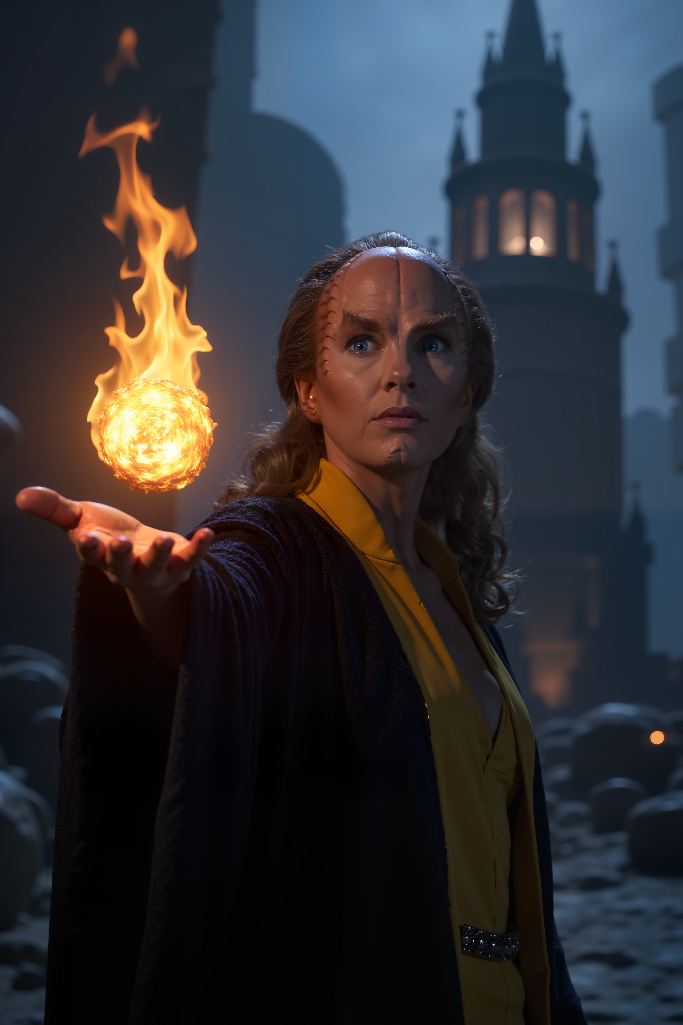 a denobulan woman with thin ridged face and deep blue eyes is extending her left hand with palm open near a mage tower dressed in black and yellow mage robe. A fireball is hovering over her left hand. Fantastic lighting. Detailed shadows.intricate details, vivid colors, hyper-detailed, ultra-sharp<lora:denobulan_FLUX>