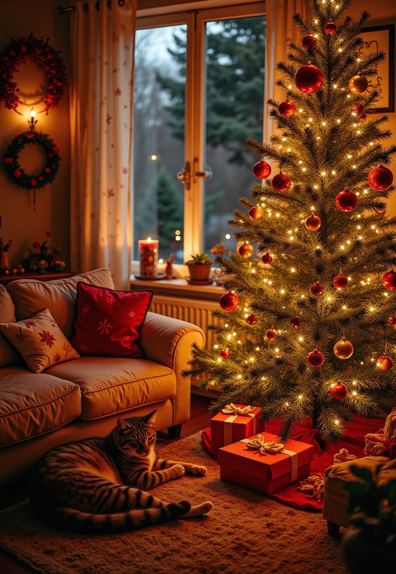 (Masterpiece, best quality, well lit, highly detailed) Christmas, Christmas party, Christmas tree, cozy, warm lighting, christmas living room, indoors, with a sleeping cat, candycane, cookies