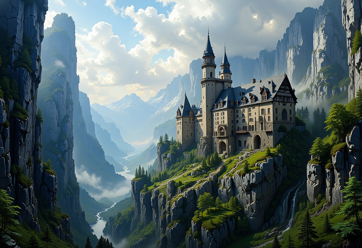 A beautiful historic German castle, wedged between huge towering glass and steal skyscrapers, Style by Ralph mcquarrie and Jeremy Mann and Lee Bogle. in the style of ck-ovf,