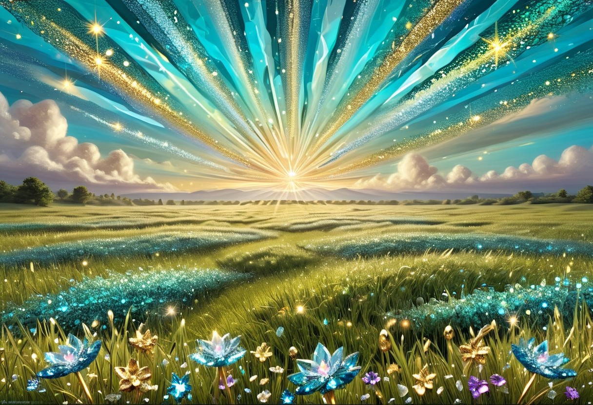 absurdres, masterpiece, breathtaking, artful, horizon, meadow ,grass shaped crystals, astral light, pamcrystal, cyan skies, gold clouds, sparkles, glitter